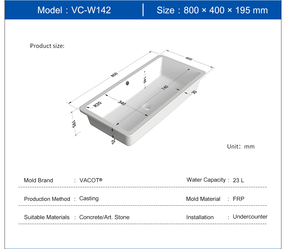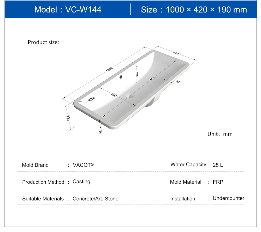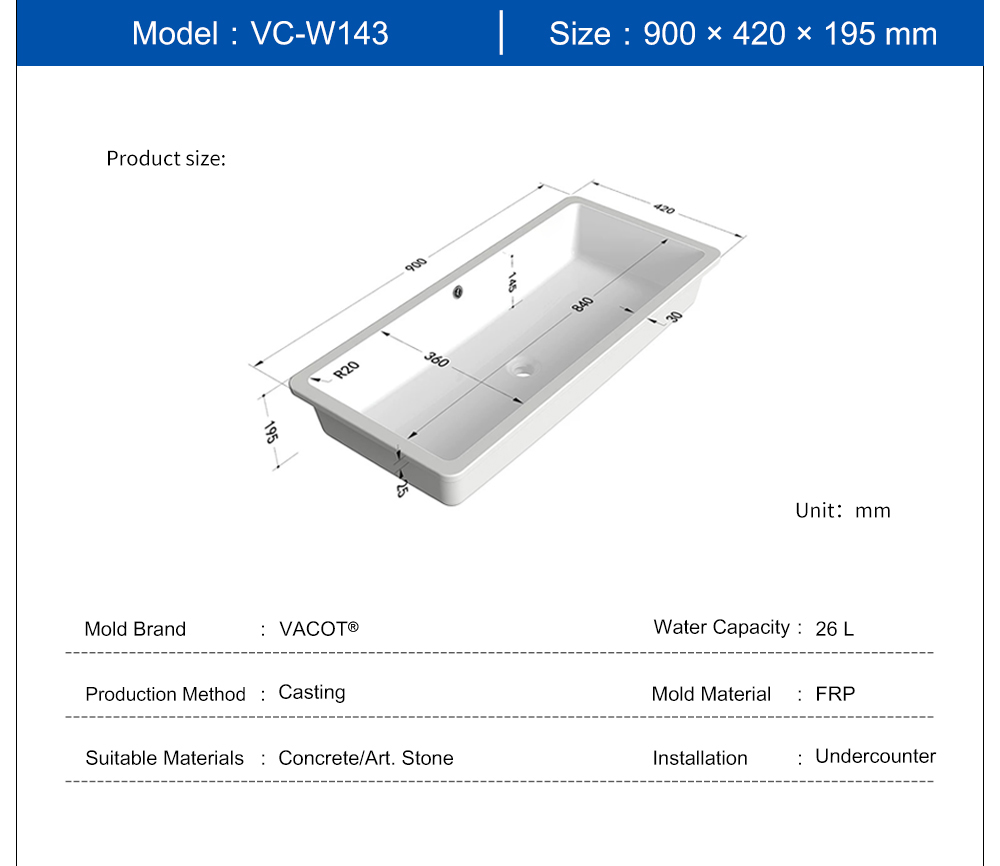 Casting Mold for Square Rounded-Corner Countertop Sink