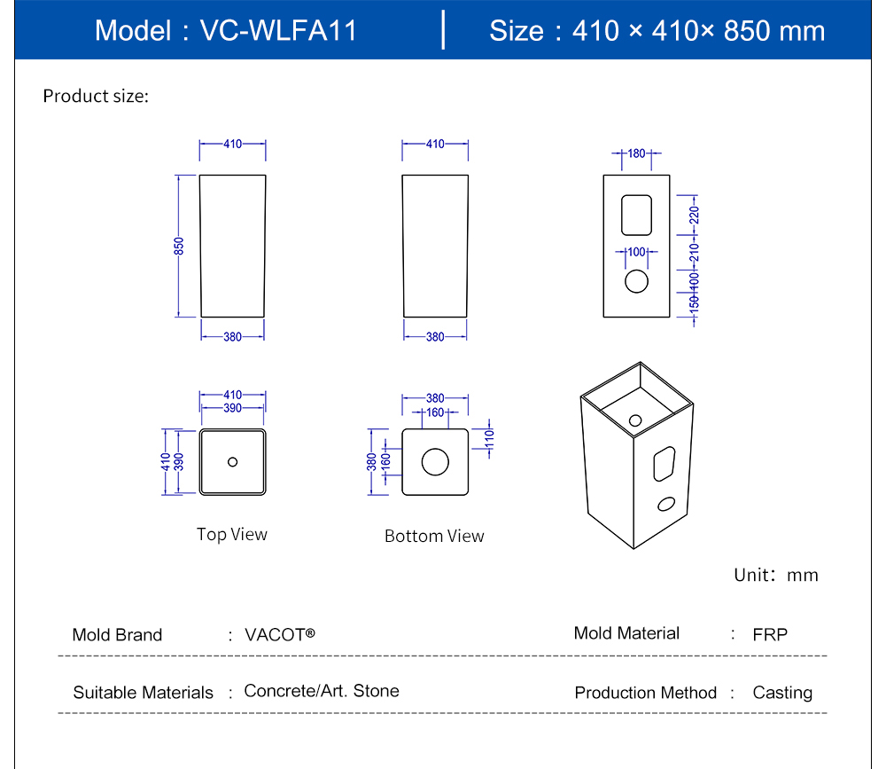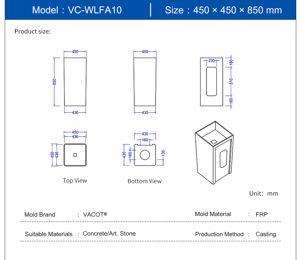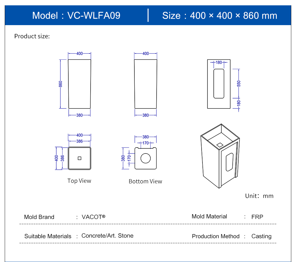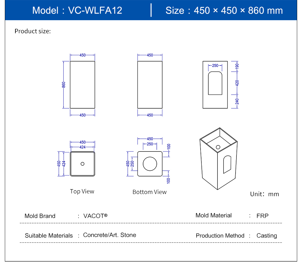 The column washbasin mold is made of high-strength FRP (fiberglass reinforced plastic), specifically designed for concrete and artificial stone casting. The high-gloss finish facilitates easy demolding. The FRP incorporates a substantial fiber-reinforced structure, providing excellent rigidity and resistance to warping, with a service life exceeding 700 uses. The mold consists of 3 or 4 interlocking pieces and features a pouring port at the top for simple operation.