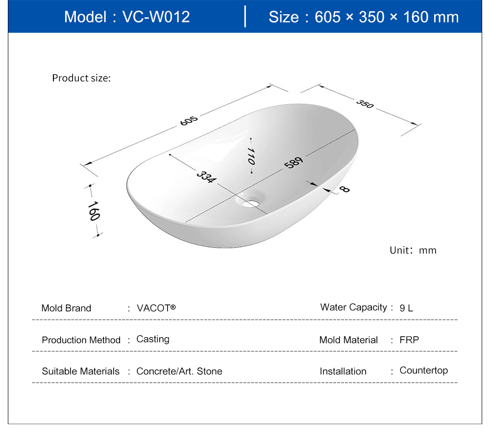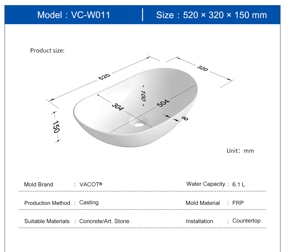 Made from high-strength FRP (fiberglass reinforced plastic), designed for concrete and artificial stone casting. The high-gloss finish facilitates easy demolding. The mold is rigid and warp-resistant, with a service life exceeding 700 uses. It consists of 2 or 3 interlocking pieces, featuring a pouring port at the top for simple operation.