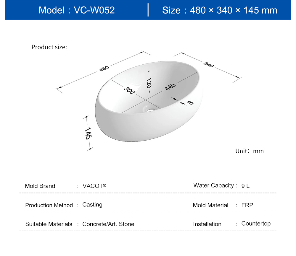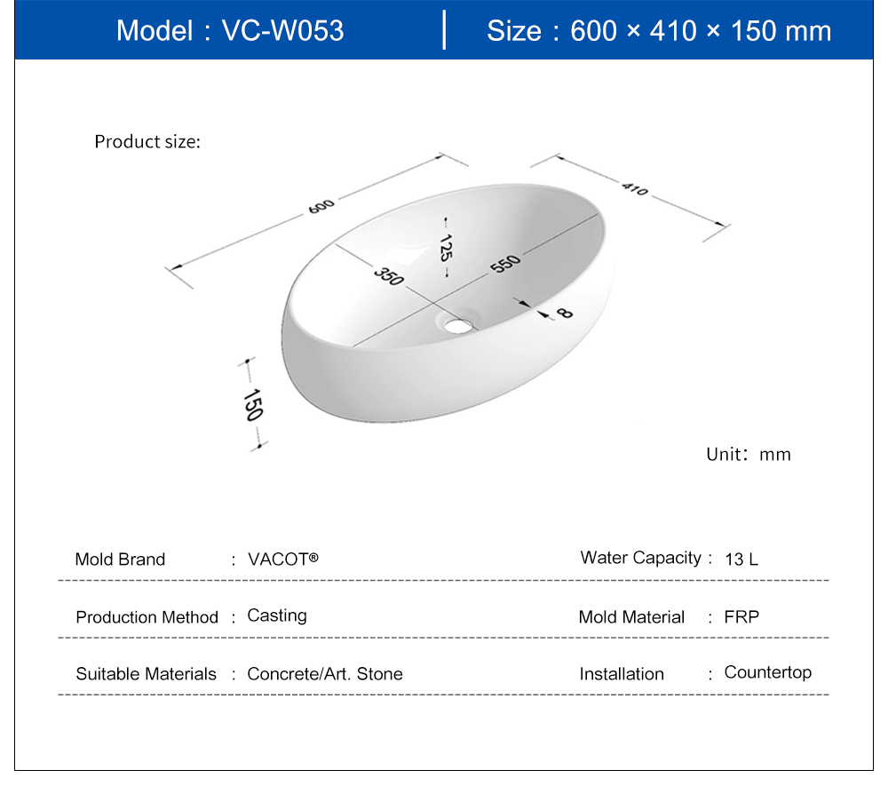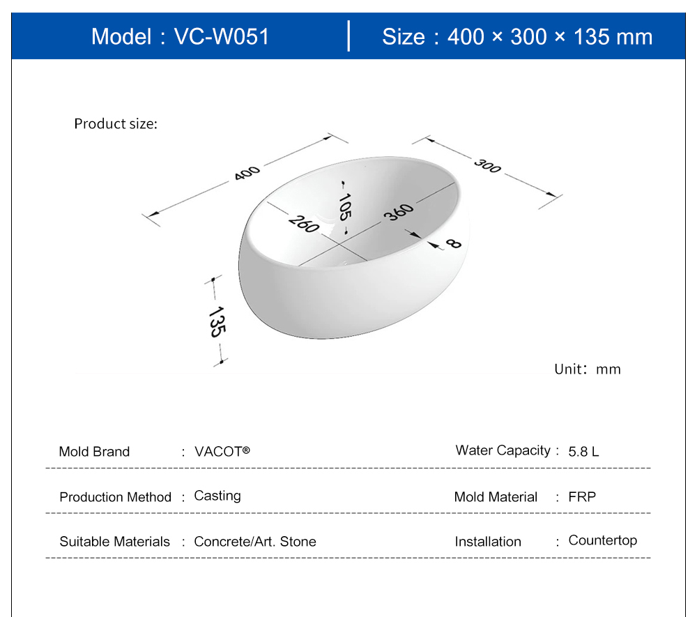 Made from high-strength FRP (fiberglass reinforced plastic), designed for concrete and artificial stone casting. The high-gloss finish facilitates easy demolding. The mold is rigid and warp-resistant, with a service life exceeding 700 uses. It consists of 2 or 3 interlocking pieces, featuring a pouring port at the top for simple operation.