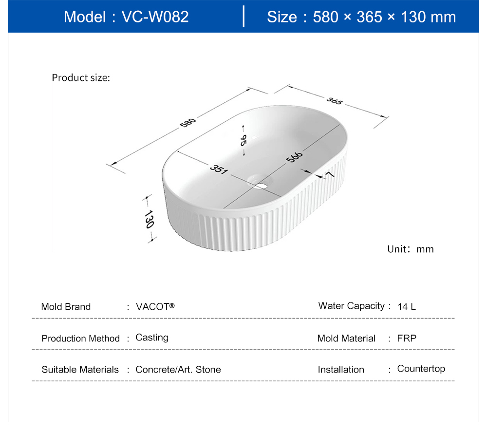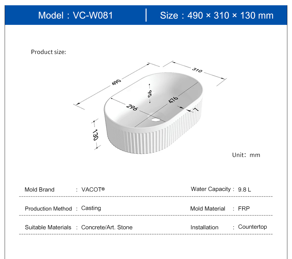 Made from high-strength FRP (fiberglass reinforced plastic), designed for concrete and artificial stone casting. The high-gloss finish facilitates easy demolding. The mold is rigid and warp-resistant, with a service life exceeding 700 uses. It consists of 2 or 3 interlocking pieces, featuring a pouring port at the top for simple operation.