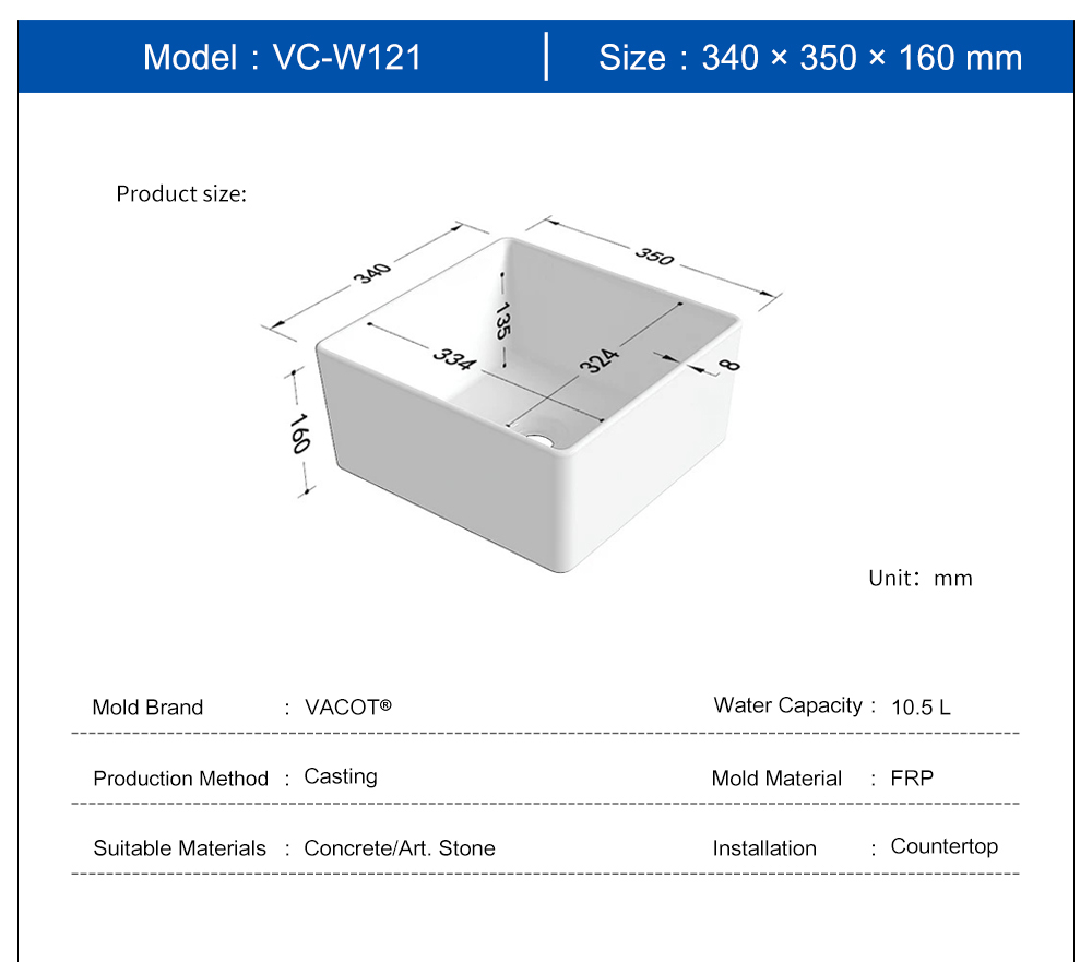 Casting Mold for Raised Square Countertop Sink