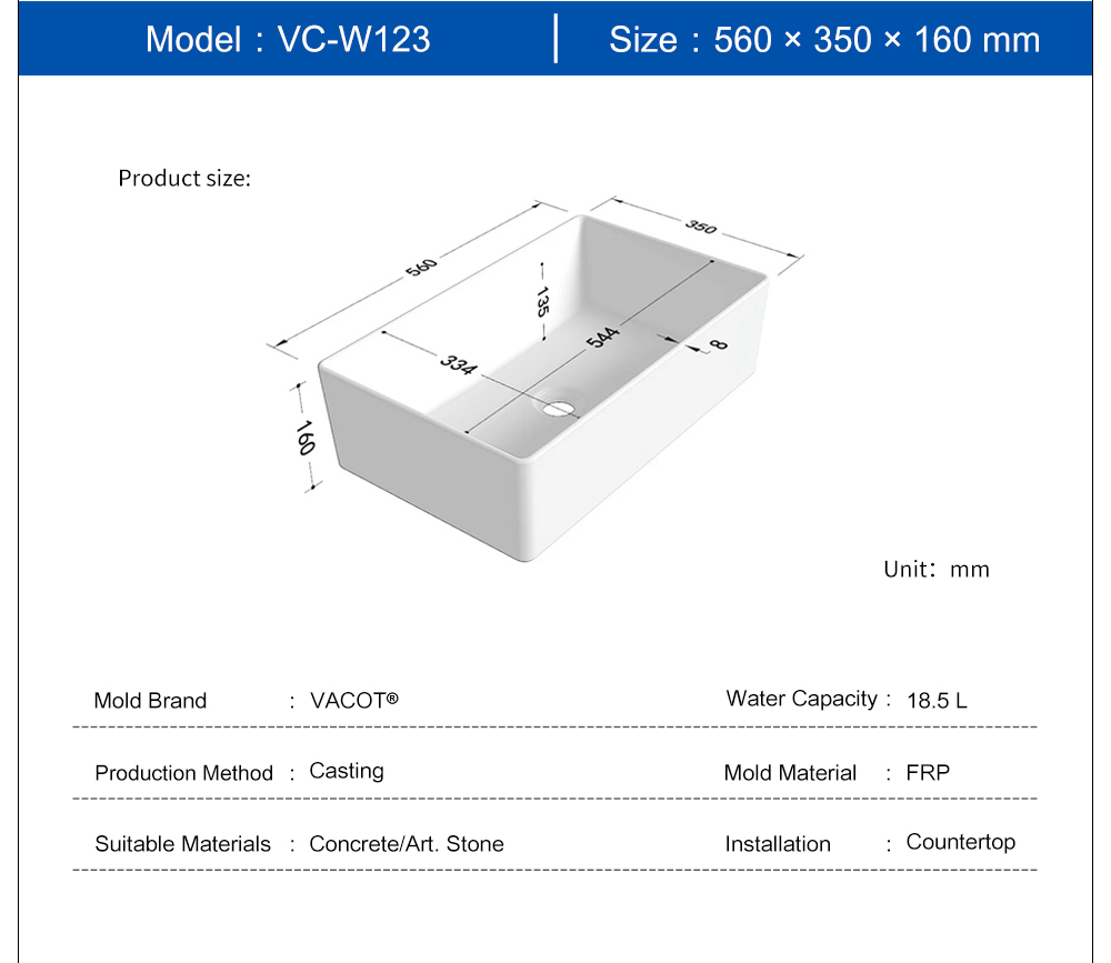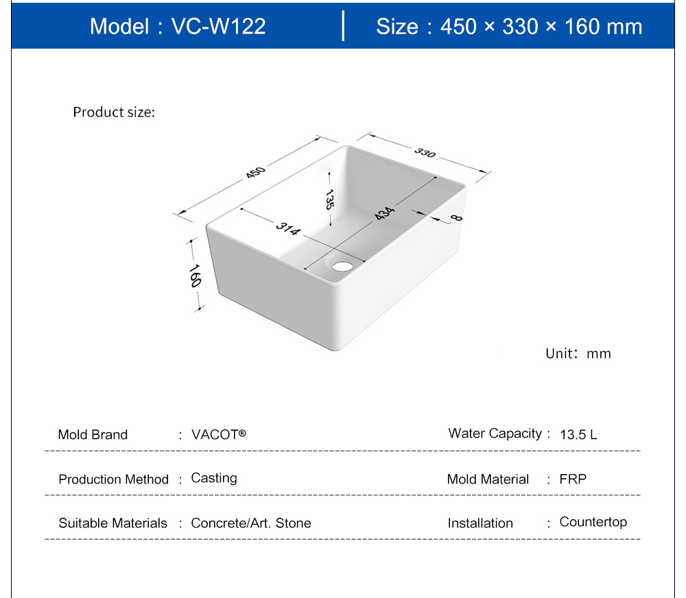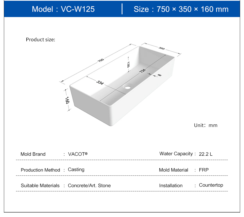 Casting Mold for Rectangular Countertop Sink