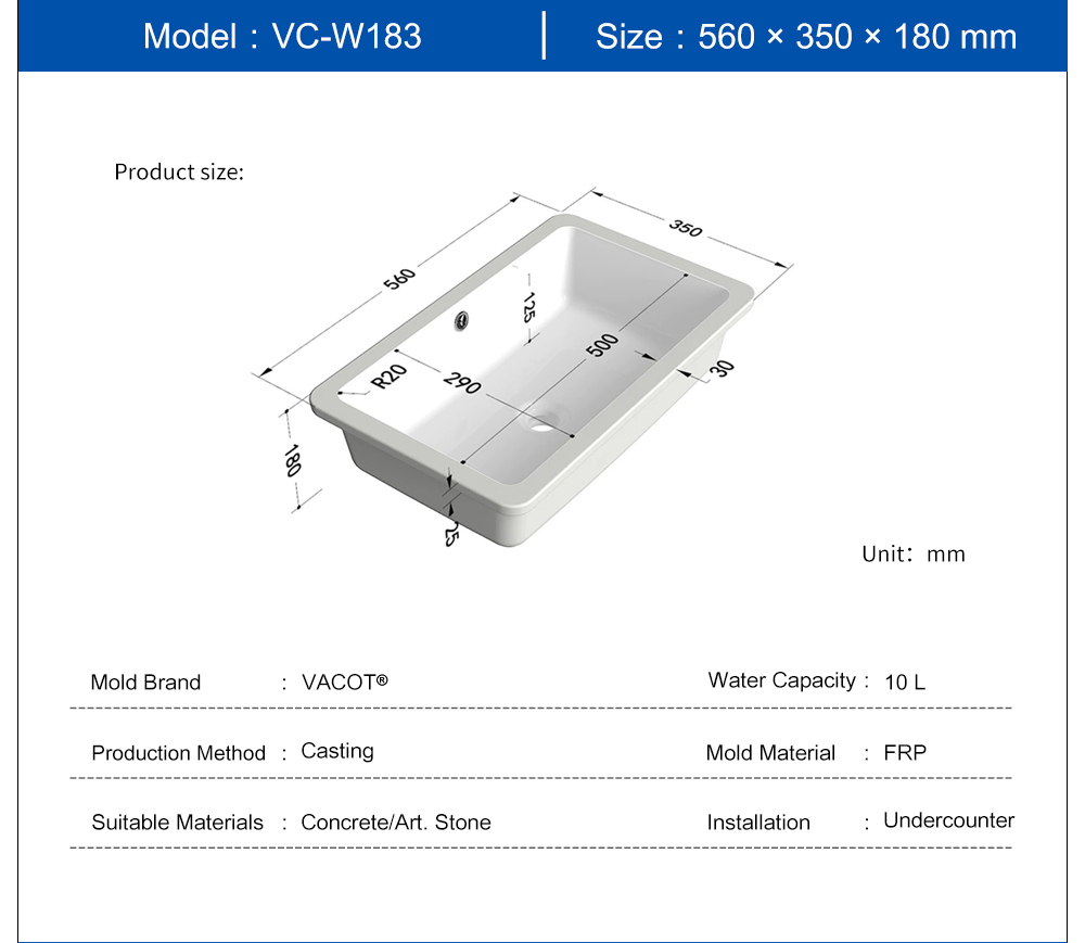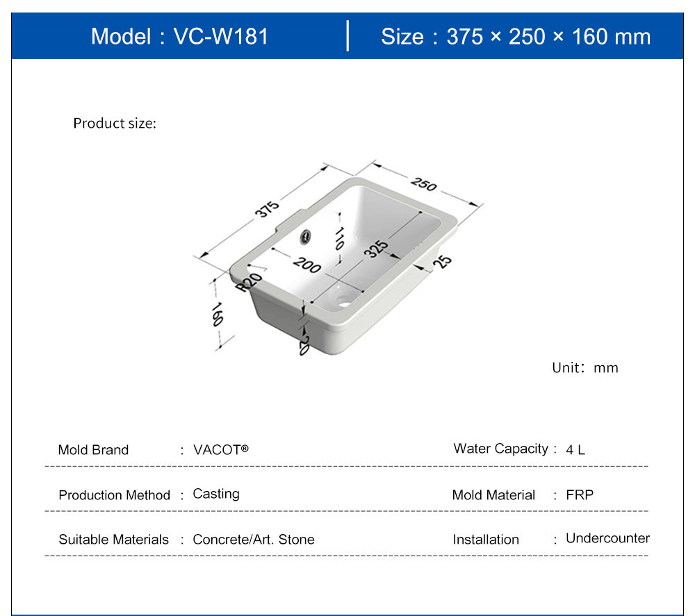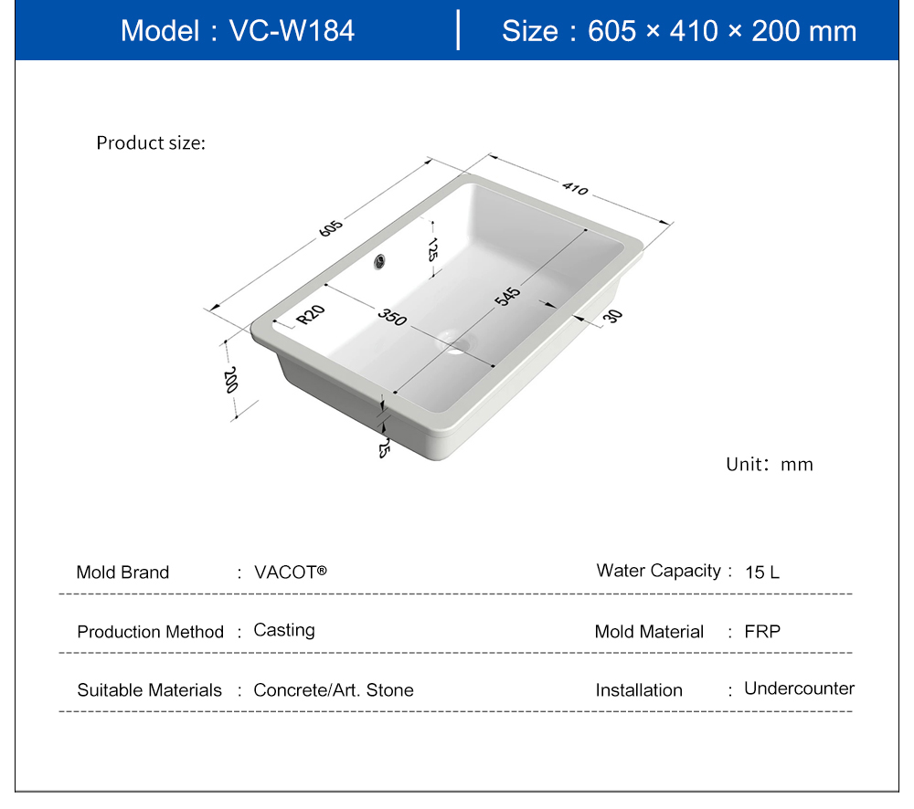 Made from high-strength FRP (fiberglass reinforced plastic), designed for concrete and artificial stone casting. The high-gloss finish facilitates easy demolding. The mold is rigid and warp-resistant, with a service life exceeding 700 uses. It consists of 2 or 3 interlocking pieces, featuring a pouring port at the top for simple operation.