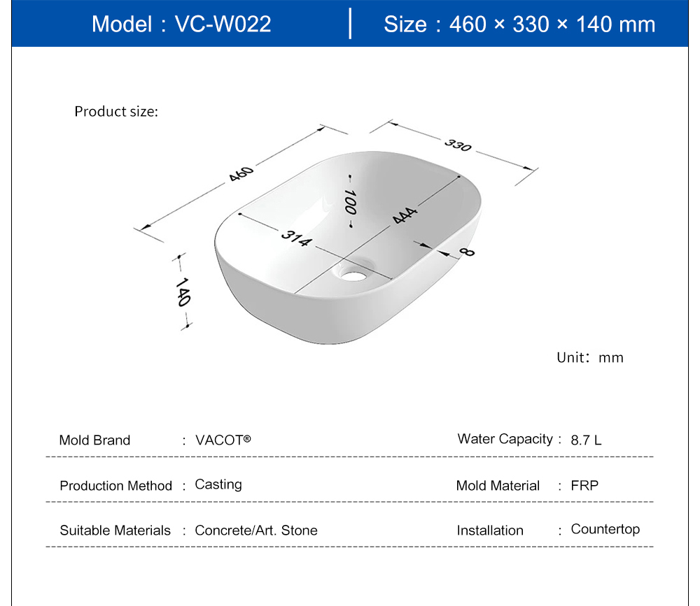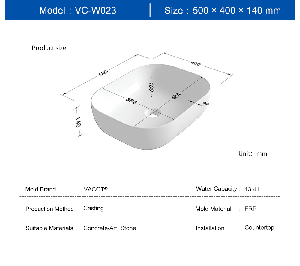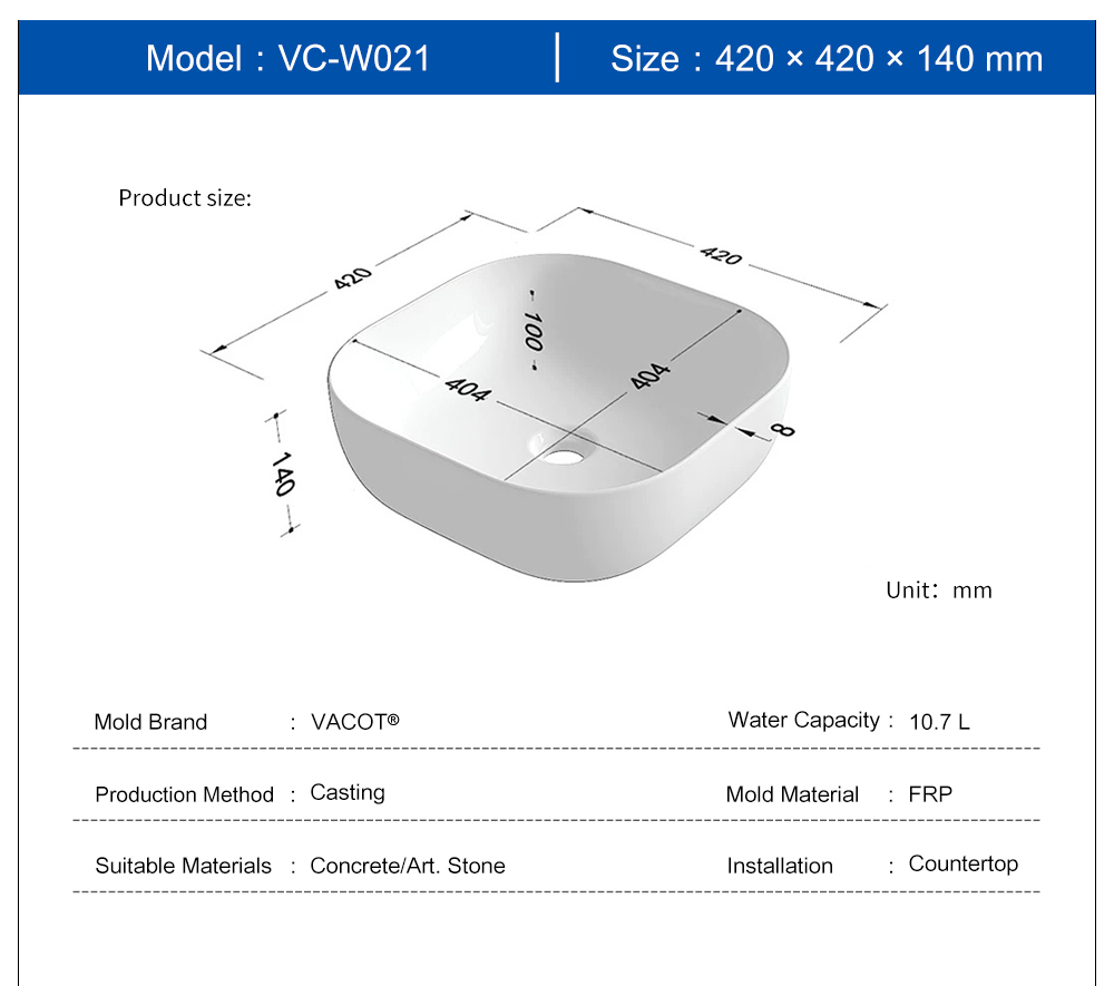 Casting Mold for Square Rounded-Corner Countertop Sink