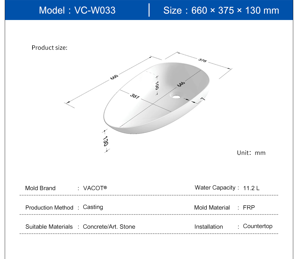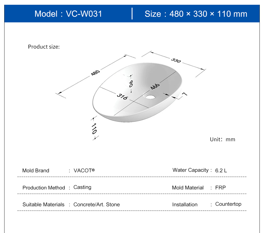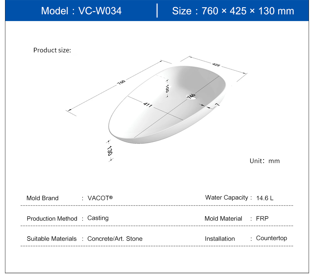 Made from high-strength FRP (fiberglass reinforced plastic), designed for concrete and artificial stone casting. The high-gloss finish facilitates easy demolding. The mold is rigid and warp-resistant, with a service life exceeding 700 uses. It consists of 2 or 3 interlocking pieces, featuring a pouring port at the top for simple operation.